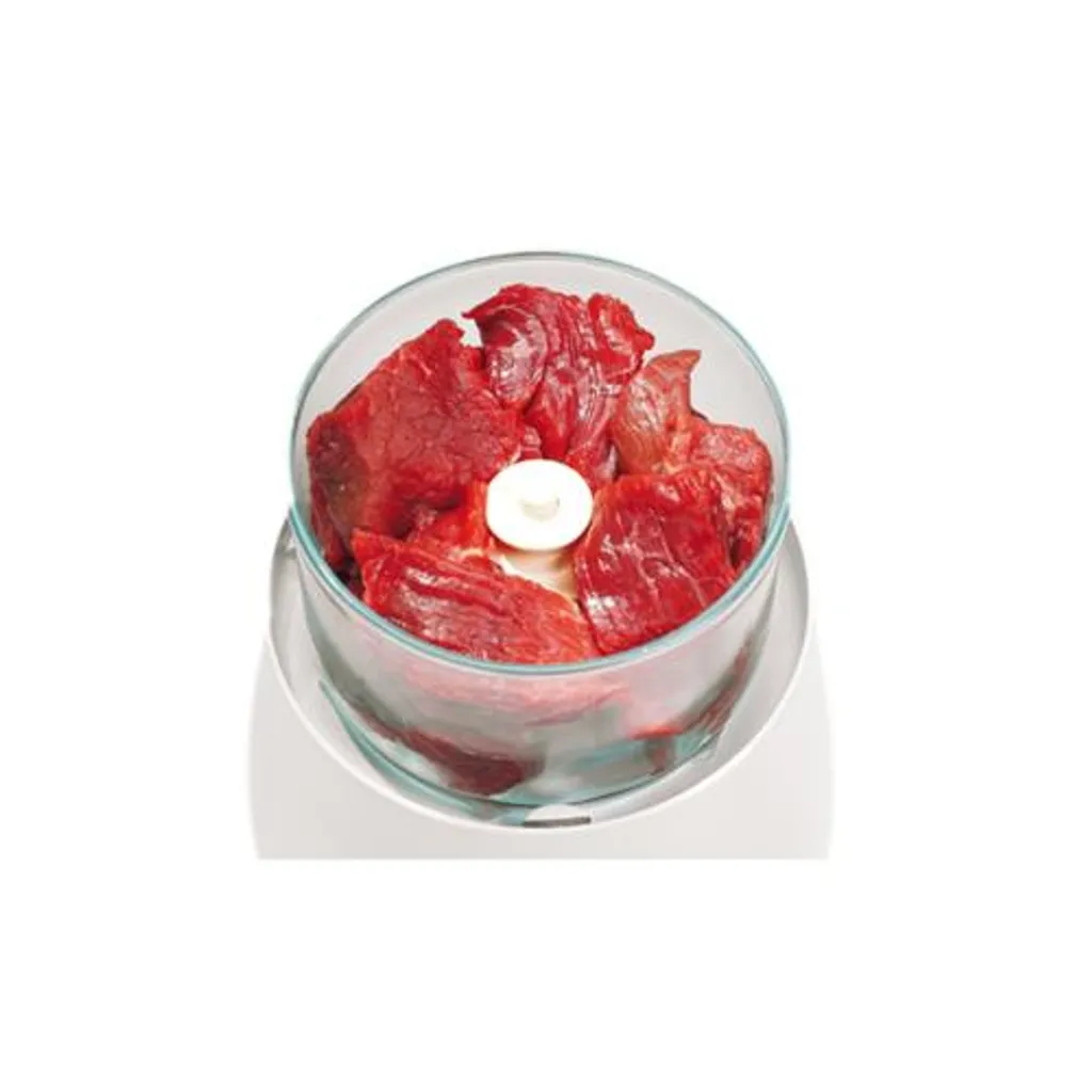 Leistungseigenschaften Leistung: 800 W, Netz-Betrieb, Fassungsvermögen: 300 g, Bedienung, Kurzbetrieb/Momentstufe, Kabelfach, Ausstattung, Universalmesser, abnehmbares Messer, Behälter aus Kunststoff, Gehäuse-Eigenschaften, Kunststoff-Gehäuse, Farben, weiss