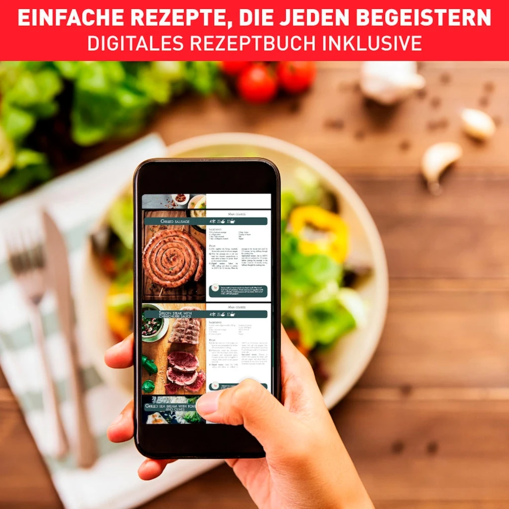 | Weitere Vorteile | Entdecken Sie die 2-in-1-Lösung, für eine gesunde Heißluftfritteuse und Grill in nur einem Gerät! Mehr als nur eine Heißluftfritteuse: Die exklusive Dual-Technologie bietet darüber hinaus eine Grillplatte aus gegossenem Aluminium für zarte, saftige Fleisch- oder Gemüsegerichte, die perfekt auf den Punkt gegrillt werden inklusive Grillstreifen. Selbstverständlich verspricht die klassische Frittierfunktion mit Heißluft knusprige, goldbraune Ergebnisse ohne Vorheizen für all ihre frittierten Lieblingsspeisen mit wenig oder ganz ohne Öl. Mit 8 automatischen Programmen, einem intuitiven digitalen Bedienfeld und einer praktischen Timer-Funktion gelingen Ihnen perfekte Ergebnisse im Handumdrehen. Es gibt sogar die Option zum Dörren von Lebensmitteln, für köstliche gesunde Snacks aus eigener Küche, wie zum Beispiel getrocknetes Obst oder Gemüse. Und mit einem XL-Fassungsvermögen sorgt Easy Fry & Grill Deluxe für das leibliche Wohl der ganzen Familie. Die perfekte Alternative zu einem klassischen Ofen, für schnellere Ergebnisse und geringeren Energieverbrauch! Worauf warten Sie noch? |