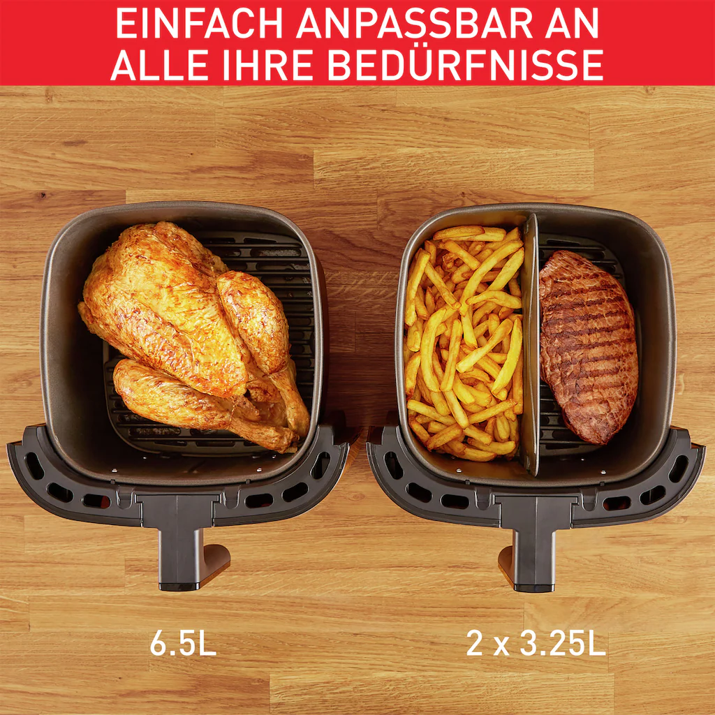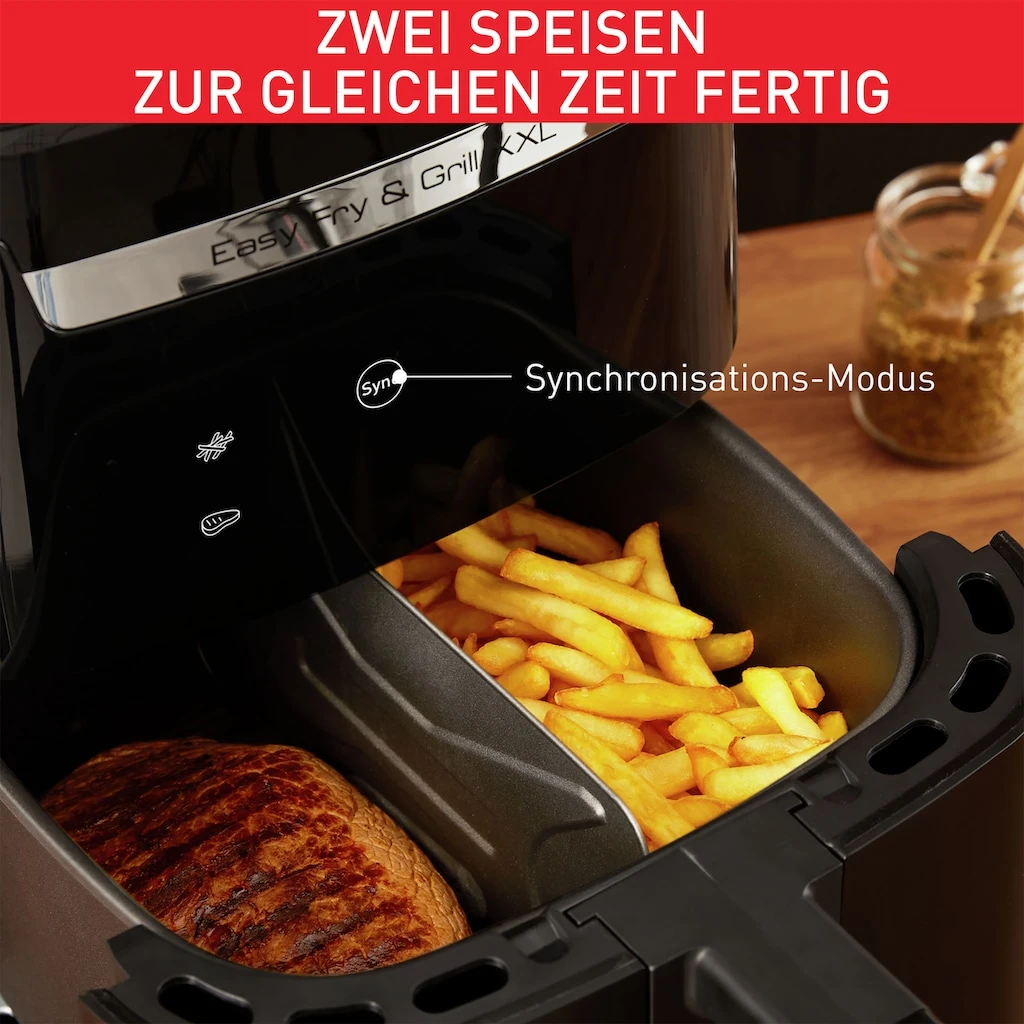 | Weitere Vorteile | Easy Fry & Grill ermöglicht knusprige, goldbraune Ergebnisse mit wenig oder ganz ohne Öl; 99% weniger Fett (1 kg frische Pommes Frites mit 15 ml Öl verglichen zu traditionellen Fritteusen mit 2 L Öl). Ein personalisierbarer Garbereich mit einer einfach abnehmbaren Flexcook-Trennwand, um von einem XXL-Fassungsvermögen für größere Speisen zum Zubereiten von 2 vollständigen Gerichten in einem Vorgang zu wechseln.Zeitsparend: Der intelligente Synchronisationsmodus mit Voreinstellungen für perfekte Ergebnisse stellt sicher, dass zwei verschiedene Speisen gleichzeitig fertig werden.Zuverlässiges Kochen: 8 automatische Garprogramme (Pommes Frites, Nuggets, Brathähnchen, Pizza, Fleisch, Fisch, Gemüse, Dessert) für Speisen, die immer gelingen, und endlos viele Kochoptionen.Grillen ohne Rauchentwicklung: Eine Grillplatte aus Druckguss-Aluminium für ein stets optimales Anbraten mit richtigen Grillstreifen, mit einer Antihaftversiegelung, und eine Zubereitung nahezu ohne Rauchentwicklung. |