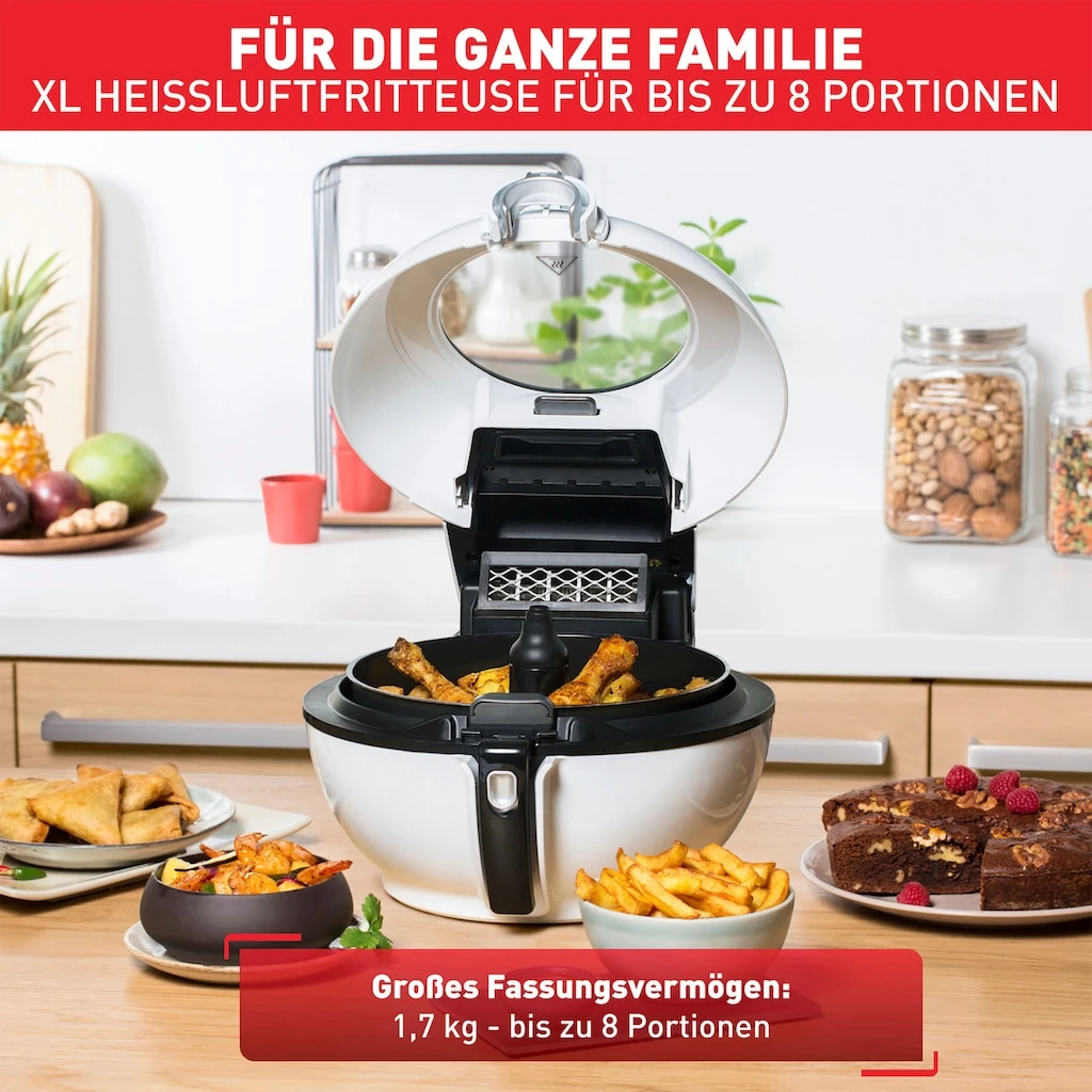 | Weitere Vorteile | Gesundes Frittieren 99% weniger Fett*: Die exklusive Dual-Motion-Technologie von ActiFry kombiniert Heißluft mit einem Rührarm für perfekte Ergebnisse mit der knusprigen Textur von frisch Frittiertem, jedoch ohne unnötiges Fett und Kalorien. *Zubereitung von 1,5 kg frischen Pommes Frites bei einem Gewichtsverlust von 55% mit 2 cl Öl gegenüber traditionellem Frittieren mit 2,2 l Öl und Zubereitung von 4 Steaks in 10 Minuten ohne Fett gegenüber traditioneller Zubereitung in einer Pfanne mit 10 g Butter in 2 Minuten pro Seite.Bereiten Sie dank eines großen Fassungsvermögens von 1,7 kg Hauptgerichte für bis zu 6 Personen und Beilagen für bis zu 8 Personen zu. |