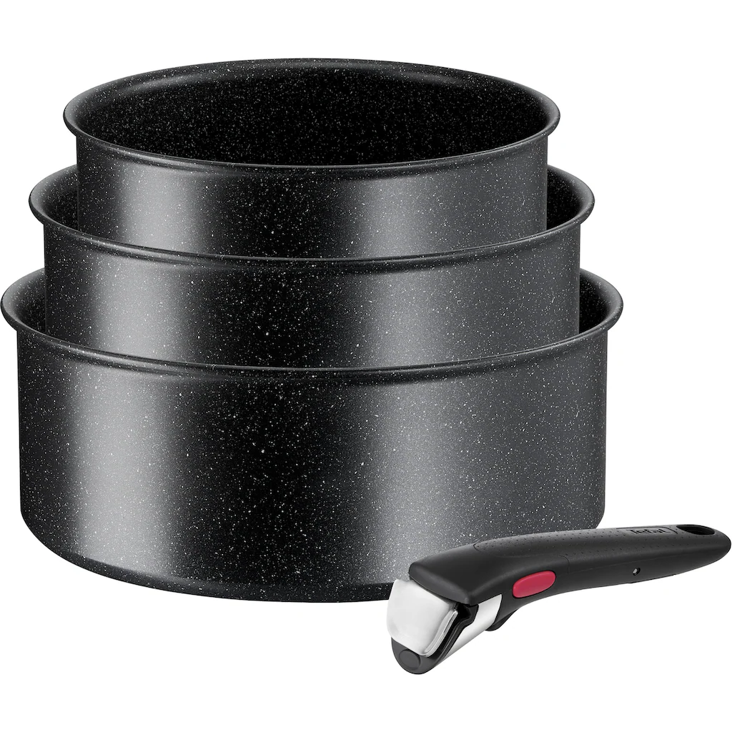 Tefal Ingenio, das vielseitige Kochgeschirr – so wird das Kochen leichter! Entdecken Sie Ingenio, ein praktisches Sortiment mit abnehmbarem Griff, das 100% sicher und leicht in der Handhabung ist. Suchen Sie nach Möglichkeiten, sich den Kochalltag in der Küche zu erleichtern? Ingenio ist die perfekte Lösung für Sie! Ein abnehmbarer Griff, mit dem Sie Ihre Töpfe und Pfannen mühelos von der Herdplatte in den Ofen oder in den Kühlschrank befördern können? Kein Problem. Darüber hinaus sorgt das platzsparende, stapelbare Design für eine leichte Verstaubarkeit in Ihren Schränken. Die patentierten, abnehmbaren Griffe können Lasten bis zu 10 kg* tragen (*internen Tests zufolge). Der Ingenio Kunststoff-Griff ist kompatibel mit allen Ingenio Serien und -formen dieser Kochgeschirr-Kategorie. Für eine anspruchsvolle Nutzung benötigen Sie ein Kochgeschirr, das Ihnen über eine lange Zeit treue Dienste erweist. Weil Tefal fest von der Kraft der Mineralien überzeugt ist, haben wir unser gesamtes Wissen in die Perfektionierung der Mineralia+ Antihaftversiegelung gesetzt, mit der unser langlebiges Black Stone Kasserollen-Set versehen ist. Dieses außergewöhnliche Kasserollen-Set ist mit extrem harten Mineralien versetzt und überzeugt durch eine einzigartige Konstruktion, die einer intensiven Nutzung standhält. Tefals exklusive Technologien runden das Paket ab und sorgen für Kasserollen, an denen Sie lange Freude haben werden: Das Thermo-Signal macht Schluss mit dem Rätselraten und ermöglicht ein perfektes Anbraten und gleichmäßige Garergebnisse dank der verbesserten Thermo-Fusion Induktionstechnologie. Dieses 4-teilige Ingenio Black Stone Set beinhaltet: 3 Kasserollen (16/18/20 cm) und einen abnehmbaren Ingenio Thermokunststoff Griff.