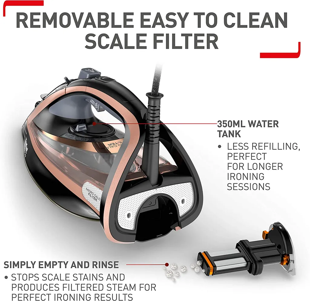 Das Tefal Ultimate Pure FV9845 ist ein leistungsstarkes Dampfbügeleisen, das dank des reinen Dampfes Kalkflecken verhindert. Die Micro-Calc Filtertechnologie verhindert, dass sich beim Bügeln Kalkflecken auf deiner Kleidung bilden. Der gefilterte und kraftvolle Dampf sorgt dafür, dass du jahrelang die Dampfleistung genießen kannst. Mit einer Leistung von 3200 Watt heizt das Gerät im Handumdrehen auf. Eine konstante Dampfleistung von bis zu 60 Gramm pro Minute hält deine Kleidung geschmeidig. Bist du nicht in der Lage, hartnäckige Falten aus deinem Lieblingsoutfit zu entfernen? Dann nutze den extra starken Dampfstoß von 260 Gramm pro Minute und du siehst wieder scharf aus. Die Durilium AirGlide Autoclean Bügelsohle gleitet über verschiedene Stoffe, sodass du schnell und mühelos ans Werk gehen kannst