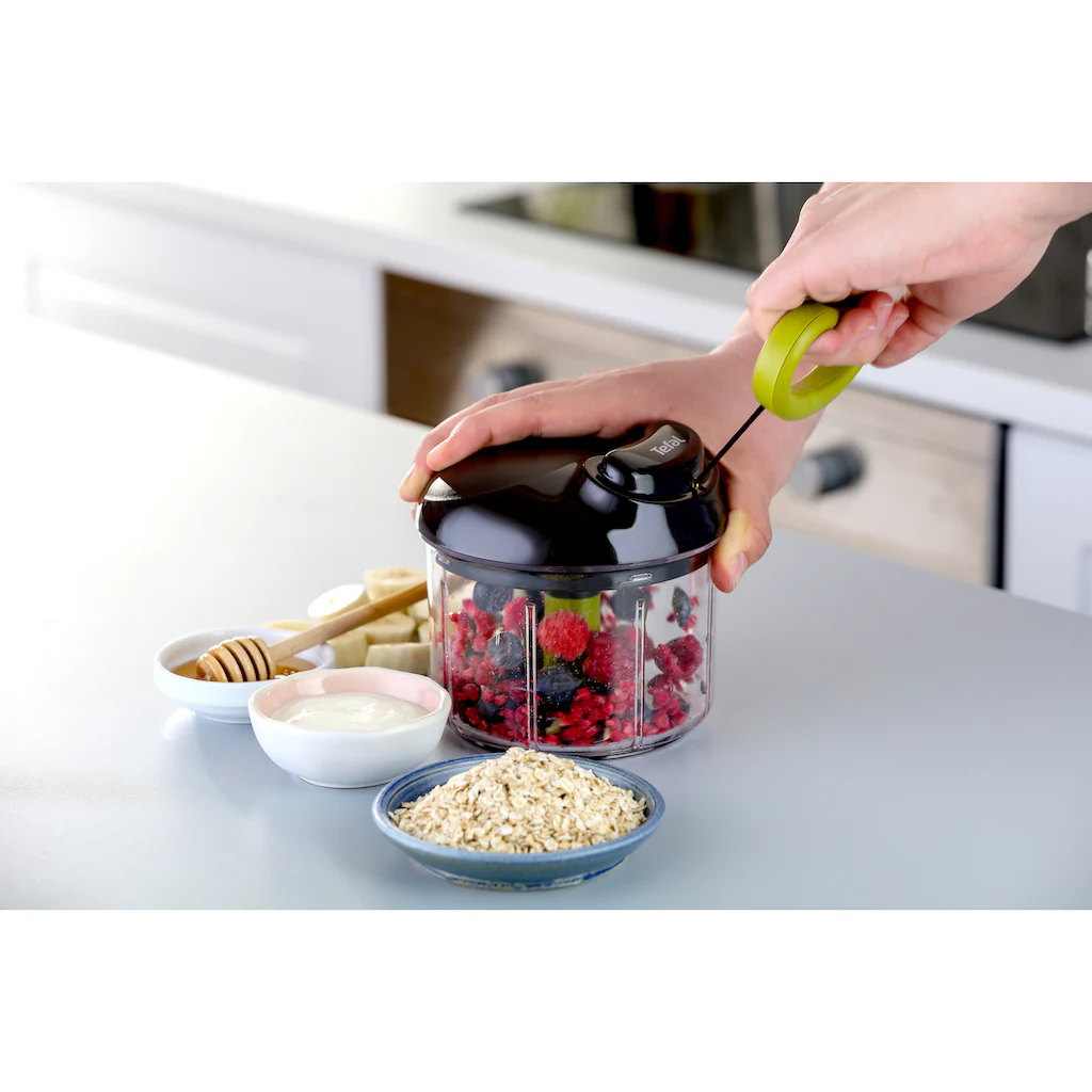 Mit dem neuen Tefal 5-Sekunden-Zerkleinerer bereitest du zu Hause schnell leckere Gerichte zu. Zwiebeln schneiden ohne Tränen, Nüsse kinderleicht zerkleinern oder köstliche Dips zubereiten: Die clevere Technologie sorgt für rasche, mühelose Ergebnisse zum Beispiel bei Guacamole- und Humus-Rezepten. Setze einfach die Klinge ein, gebe die Zutat hinein, schließe den Deckel und ziehen am Seilzug, je öfter du ziehen, desto feiner wird zerkleinert. Dieser umweltfreundliche Gemüseschneider mit patentiertem Booster-System verfügt über robuste, voneinander unabhängige Klingen, die sich für jede Art von Lebensmittel eignen, sowie über eine sichere Verschlusstechnik für eine einfache und sichere Benutzung. Zugleich lässt sich beim Zerkleinern die gewünschte Größe der Zutaten dank des transparenten Behälters leicht kontrollieren. Der ergonomische Soft-Touch-Griff und der rutschfeste Boden sorgen für größten Komfort beim Benutzen. Der Tefal 5-Sekunden-Zerkleinerer: Köstliche, einfache Gerichte schnell zubereiten, völlig ohne Stress.